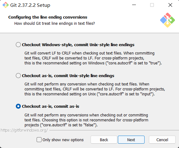 as-is的意思是原本是什么样就是什么样,Git 不会转换换行符。以下这两种方式是最容易出问题的,当原本的换行符被替换时,整个文件将发生冲突。- Checkout Windows-style, commit Unix-style: 拉取时转换为 Windows 换行符,和用户本地一致,提交时自动转换为 Unix 风格换行符。可以用